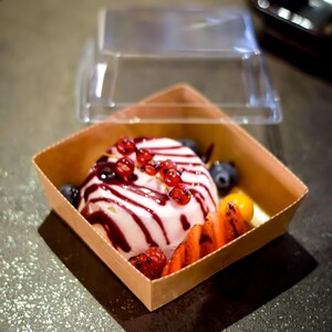 Gelato 100 % vegetale guarnito con frutta fresca e topping amarena